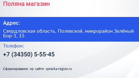 Поляна, магазин по адресу Свердловская область, Полевской, микрорайон Зелёный Бор-1, 15 в дальнейшем Организация, размещена в следующих категориях: