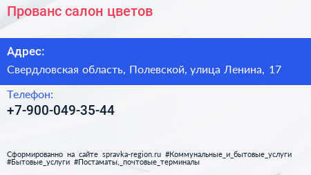 Прованс, салон цветов по адресу Свердловская область, Полевской, улица Ленина, 17 в дальнейшем Организация, размещена в следующих категориях: