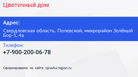 Цветочный дом по адресу Свердловская область, Полевской, микрорайон Зелёный Бор-1, 4а в дальнейшем Организация, размещена в следующих категориях: