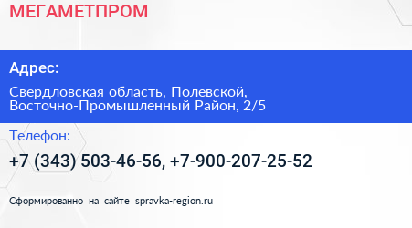 МЕГАМЕТПРОМ по адресу Свердловская область, Полевской, Восточно-Промышленный Район, 2/5 в дальнейшем Организация, размещена в следующих категориях: