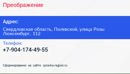 Преображение по адресу Свердловская область, Полевской, улица Розы Люксембург, 112 в дальнейшем Организация, размещена в следующих категориях: