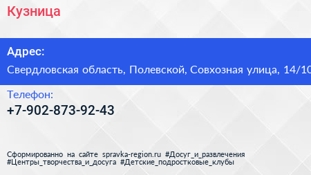 Кузница по адресу Свердловская область, Полевской, Совхозная улица, 14/10 в дальнейшем Организация, размещена в следующих категориях:
