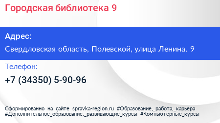 Городская библиотека №9 по адресу Свердловская область, Полевской, улица Ленина, 9 в дальнейшем Организация, размещена в следующих категориях: