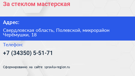 За стеклом, мастерская по адресу Свердловская область, Полевской, микрорайон Черёмушки, 18 в дальнейшем Организация, размещена в следующих категориях: