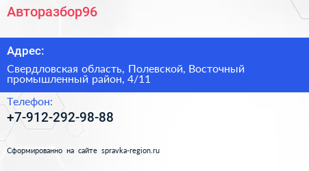 Авторазбор96 по адресу Свердловская область, Полевской, Восточный промышленный район, 4/11 в дальнейшем Организация, размещена в следующих категориях: