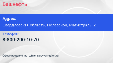 Башнефть по адресу Свердловская область, Полевской, Магистраль, 2 в дальнейшем Организация, размещена в следующих категориях: