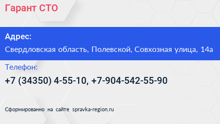 Гарант, СТО по адресу Свердловская область, Полевской, Совхозная улица, 14а в дальнейшем Организация, размещена в следующих категориях:
