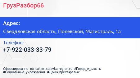 ГрузРазбор66 по адресу Свердловская область, Полевской, Магистраль, 1а в дальнейшем Организация, размещена в следующих категориях: