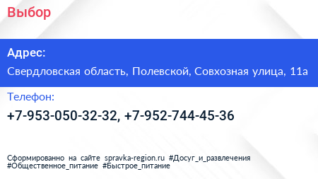 Выбор по адресу Свердловская область, Полевской, Совхозная улица, 11а в дальнейшем Организация, размещена в следующих категориях: