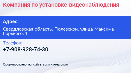Компания по установке видеонаблюдения по адресу Свердловская область, Полевской, улица Максима Горького, 1 в дальнейшем Организация, размещена в следующих категориях: