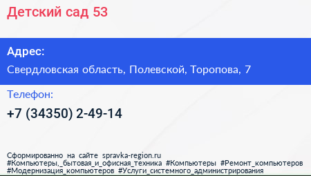 Детский сад №53 по адресу Свердловская область, Полевской, Торопова, 7 в дальнейшем Организация, размещена в следующих категориях: