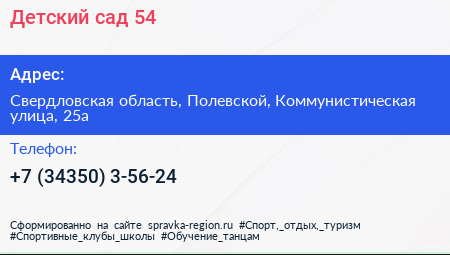 Детский сад №54 по адресу Свердловская область, Полевской, Коммунистическая улица, 25а в дальнейшем Организация, размещена в следующих категориях: