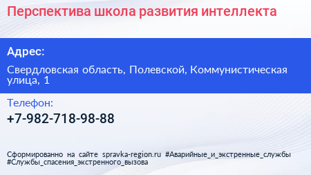 Перспектива, школа развития интеллекта по адресу Свердловская область, Полевской, Коммунистическая улица, 1 в дальнейшем Организация, размещена в следующих категориях: