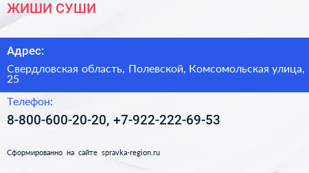 ЖИШИ СУШИ по адресу Свердловская область, Полевской, Комсомольская улица, 25 в дальнейшем Организация, размещена в следующих категориях: