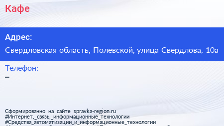 Кафе по адресу Свердловская область, Полевской, улица Свердлова, 10а в дальнейшем Организация, размещена в следующих категориях: