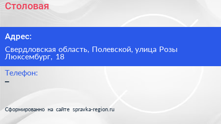 Столовая по адресу Свердловская область, Полевской, улица Розы Люксембург, 18 в дальнейшем Организация, размещена в следующих категориях: