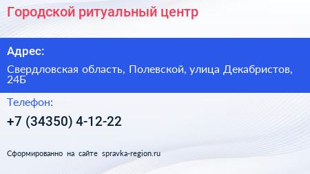 Городской ритуальный центр по адресу Свердловская область, Полевской, улица Декабристов, 24Б в дальнейшем Организация, размещена в следующих категориях: