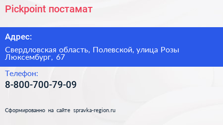Pickpoint, постамат по адресу Свердловская область, Полевской, улица Розы Люксембург, 67 в дальнейшем Организация, размещена в следующих категориях: