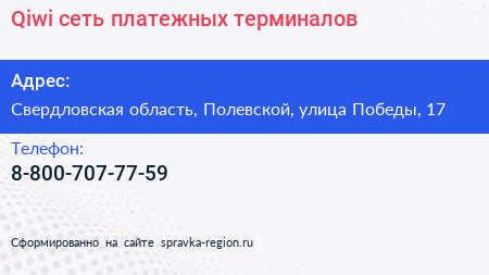Qiwi, сеть платежных терминалов по адресу Свердловская область, Полевской, улица Победы, 17 в дальнейшем Организация, размещена в следующих категориях: