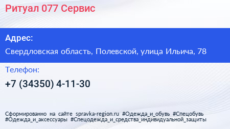 Ритуал 077 Сервис по адресу Свердловская область, Полевской, улица Ильича, 78 в дальнейшем Организация, размещена в следующих категориях: