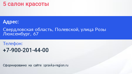 №5, салон красоты по адресу Свердловская область, Полевской, улица Розы Люксембург, 67 в дальнейшем Организация, размещена в следующих категориях: