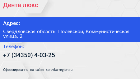 Дента-люкс по адресу Свердловская область, Полевской, Коммунистическая улица, 2 в дальнейшем Организация, размещена в следующих категориях:
