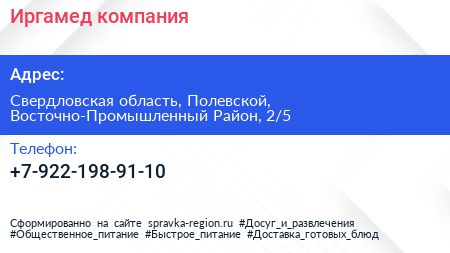 Иргамед, компания по адресу Свердловская область, Полевской, Восточно-Промышленный Район, 2/5 в дальнейшем Организация, размещена в следующих категориях: