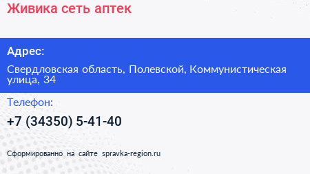 Живика, сеть аптек по адресу Свердловская область, Полевской, Коммунистическая улица, 34 в дальнейшем Организация, размещена в следующих категориях: