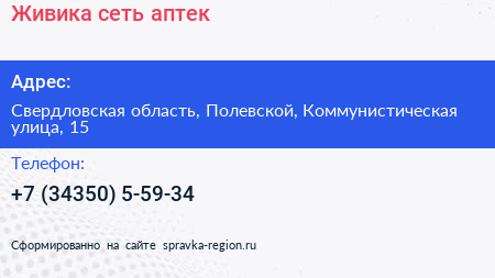 Живика, сеть аптек по адресу Свердловская область, Полевской, Коммунистическая улица, 15 в дальнейшем Организация, размещена в следующих категориях:
