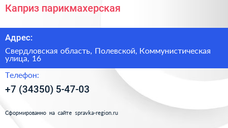Каприз, парикмахерская по адресу Свердловская область, Полевской, Коммунистическая улица, 16 в дальнейшем Организация, размещена в следующих категориях: