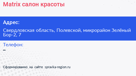 Matrix, салон красоты по адресу Свердловская область, Полевской, микрорайон Зелёный Бор-2, 7 в дальнейшем Организация, размещена в следующих категориях: