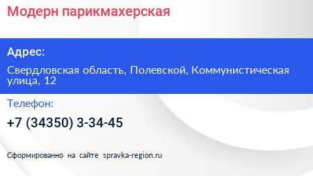 Модерн, парикмахерская по адресу Свердловская область, Полевской, Коммунистическая улица, 12 в дальнейшем Организация, размещена в следующих категориях: