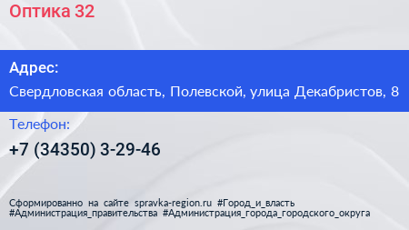 Оптика №32 по адресу Свердловская область, Полевской, улица Декабристов, 8 в дальнейшем Организация, размещена в следующих категориях: