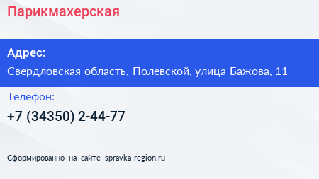 Парикмахерская по адресу Свердловская область, Полевской, улица Бажова, 11 в дальнейшем Организация, размещена в следующих категориях: