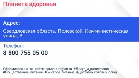 Планета здоровья по адресу Свердловская область, Полевской, Коммунистическая улица, 8 в дальнейшем Организация, размещена в следующих категориях: