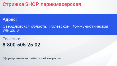 Стрижка-SHOP, парикмахерская по адресу Свердловская область, Полевской, Коммунистическая улица, 8 в дальнейшем Организация, размещена в следующих категориях:
