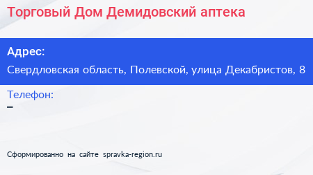 Торговый Дом Демидовский, аптека по адресу Свердловская область, Полевской, улица Декабристов, 8 в дальнейшем Организация, размещена в следующих категориях: