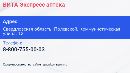ВИТА Экспресс, аптека по адресу Свердловская область, Полевской, Коммунистическая улица, 12 в дальнейшем Организация, размещена в следующих категориях: