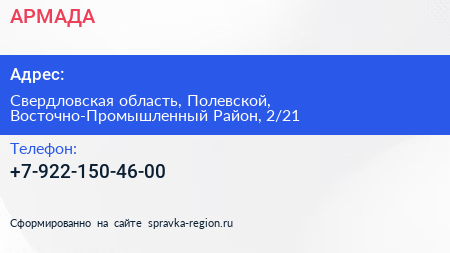 АРМАДА по адресу Свердловская область, Полевской, Восточно-Промышленный Район, 2/21 в дальнейшем Организация, размещена в следующих категориях:
