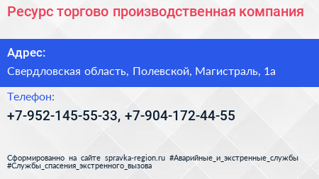 Ресурс, торгово-производственная компания по адресу Свердловская область, Полевской, Магистраль, 1а в дальнейшем Организация, размещена в следующих категориях: