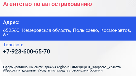 Агентство по автострахованию по адресу 652560, Кемеровская область, Полысаево, Космонавтов, 67 в дальнейшем Организация, размещена в следующих категориях: