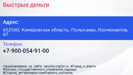 Быстрые деньги по адресу 652560, Кемеровская область, Полысаево, Космонавтов, 67 в дальнейшем Организация, размещена в следующих категориях: