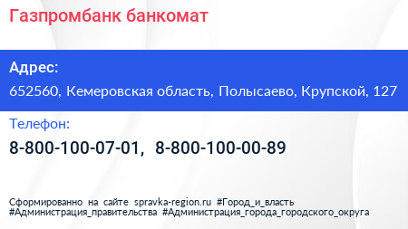 Газпромбанк, банкомат по адресу 652560, Кемеровская область, Полысаево, Крупской, 127 в дальнейшем Организация, размещена в следующих категориях: