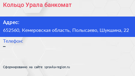 Кольцо Урала, банкомат по адресу 652560, Кемеровская область, Полысаево, Шукшина, 22 в дальнейшем Организация, размещена в следующих категориях: