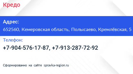 Кредо по адресу 652560, Кемеровская область, Полысаево, Кремлёвская, 5 в дальнейшем Организация, размещена в следующих категориях: