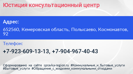Юстиция, консультационный центр по адресу 652560, Кемеровская область, Полысаево, Космонавтов, 92 в дальнейшем Организация, размещена в следующих категориях: