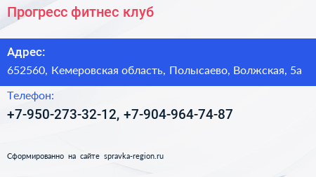 Прогресс, фитнес-клуб по адресу 652560, Кемеровская область, Полысаево, Волжская, 5а в дальнейшем Организация, размещена в следующих категориях: