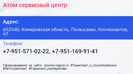 Атом, сервисный центр по адресу 652560, Кемеровская область, Полысаево, Космонавтов, 67 в дальнейшем Организация, размещена в следующих категориях: