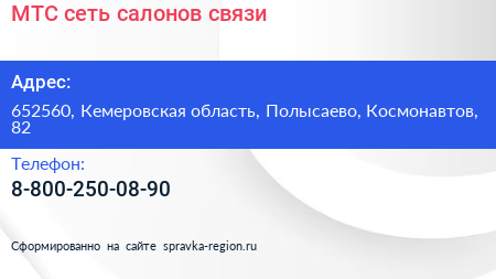 МТС, сеть салонов связи по адресу 652560, Кемеровская область, Полысаево, Космонавтов, 82 в дальнейшем Организация, размещена в следующих категориях: