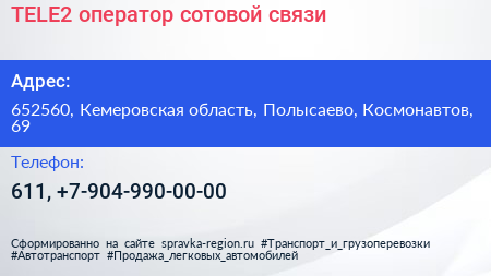 TELE2, оператор сотовой связи по адресу 652560, Кемеровская область, Полысаево, Космонавтов, 69 в дальнейшем Организация, размещена в следующих категориях: